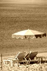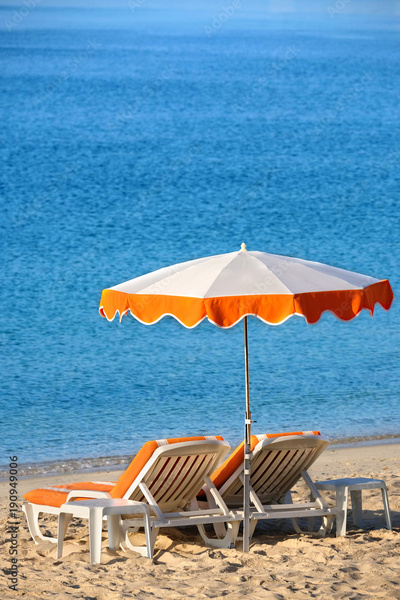 Mediterranean beach resort with chair and sun umbrella summer holiday vacation photo