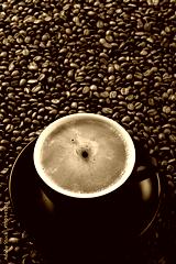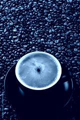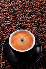 Black coffee cup and saucer one single for espresso or capuccino filled full of coffee beans on a background of scattered dark coffee beans photo vertical
