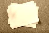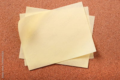 Untidy heap pile or stack of several lots yellow sticky post it note oblong on a cork bulletin or notice board background photo