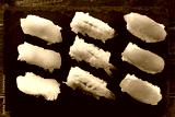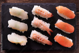 Sushi japanese japan food various selection raw fish salmon prawn shrimp in a row line on a black slate platter photo