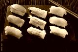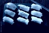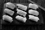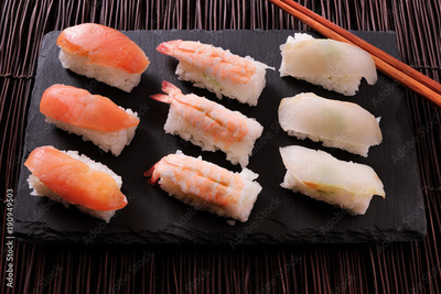 Sushi japanese japan food various selection raw fish salmon prawn shrimp in a row line on a black slate platter photo