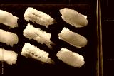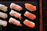 Sushi japanese japan food various selection raw fish salmon prawn shrimp in a row line on a black slate platter photo