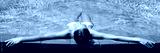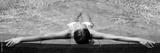 Luxury resort woman relaxing in infinity swim pool. Asian young adult lying down in swimming pool of beach resort for summer holidays or travel vacations banner.