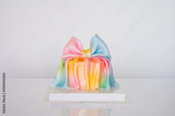 Colorful rainbow gift cake with a large fabric bow on a clean white background.