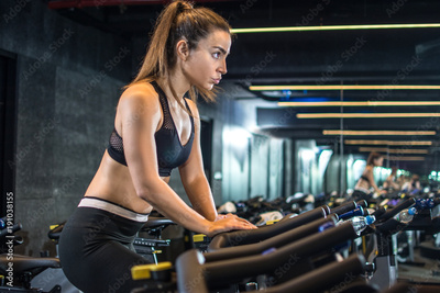Side view of young beautiful woman in sportswear looking away while cycling at gym.