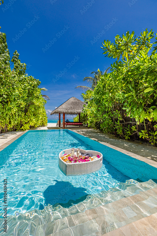 Stunning pool luxury resort floating tray breakfast table. Romantic couple vacation honeymoon vibes Maldives island exclusive experience tropical morning dining lifestyle paradise serenity