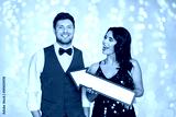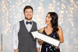 happy couple with big arrow at party