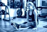 Fit young woman doing arm balancing yoga training, handstand in L-sit position at gym.