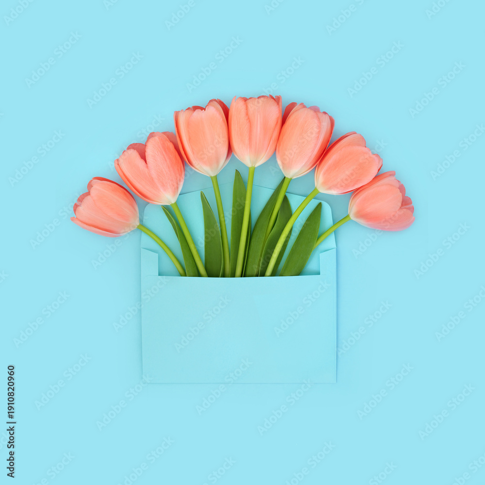 Orange tulip flowers with envelope on blue background. Surreal abstract design surprise for birthday card, Mothers Day, Spring, Beltane, Easter celebrations.