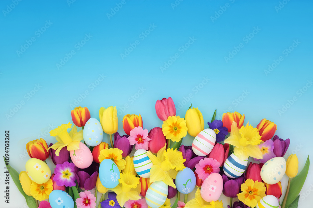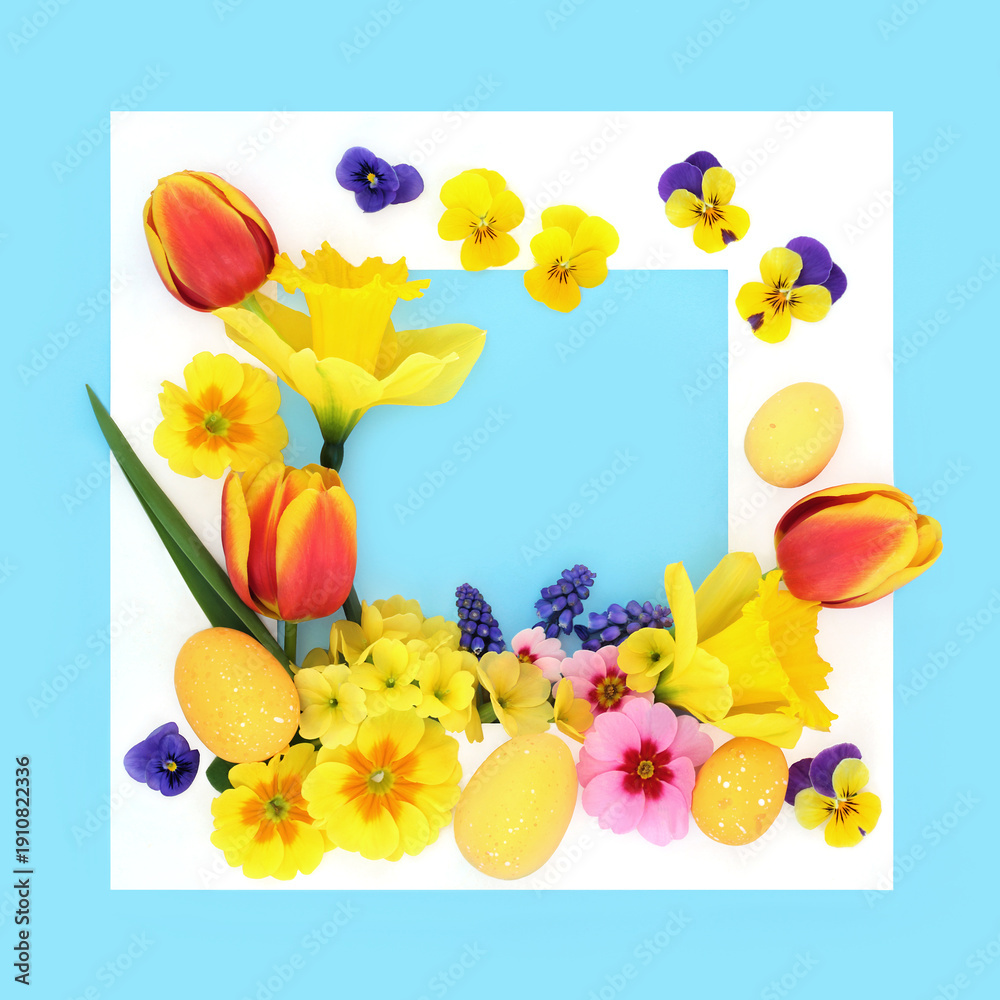 Easter eggs spring flower abstract background decoration on blue, white square frame. Colorful floral candy food art design for the holiday season.