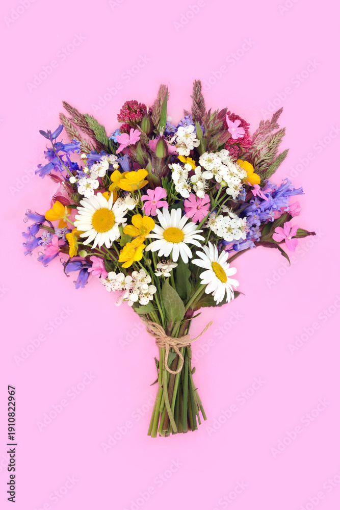 Springtime wildflower bouquet with spring flowers on pink. Tied natural posy for Mothers Day, Beltane festival, birthday gift. Floral nature flower arrangement.