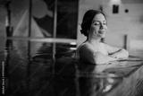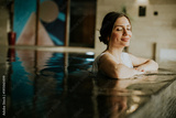 Woman relaxes in water at modern spa with art on wall during calm day