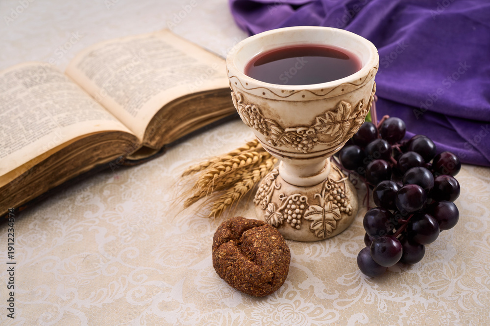 Holy communion with chalice, wine, bread, grapes, bible, symbolizing religion