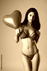 Sexy girl in red lingerie is posing with heart shaped balloon.