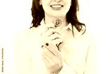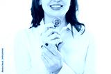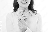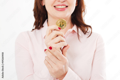 Gold Bitcoin Coin in business woman hands isolated on white background. Blockchain and finance concept. Selective focus. Red manicure