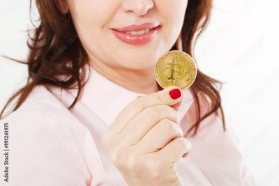 Gold Bitcoin Coin in smiling business woman hands isolated on white background. Blockchain and finance concept. Selective focus. Red manicure