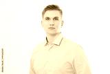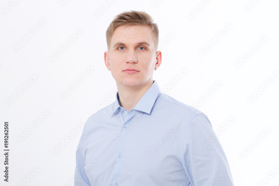 Happy businessman isolated on white background. Blue template and blank Shirt on man. Copy space and mock up