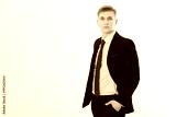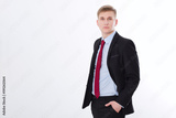 Serious businessman in black suit and red tie isolated on white background. Business concept. Copy space and mock up