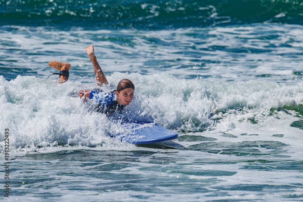 Young teenage surfer at surf school riding a wave on belly