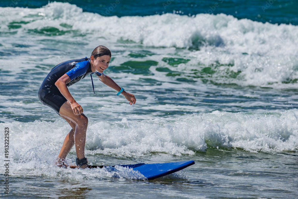 Happy teen surfer in suit skillfully riding wave at sunny beach