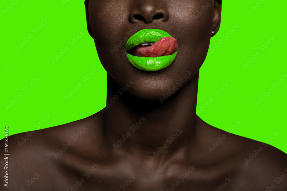 afro black woman with green lipstick and background
