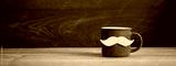 Green enamel mug with a yellow mustache decoration standing on a wooden surface, representing Father Day, masculinity, men's style, and a greeting concept