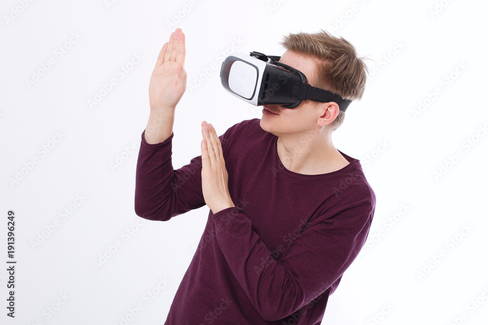 Excited young man in a VR headset, glasses. Virtual reality isolated on white background. Copy space and mock up