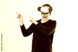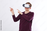 Excited young man in a VR headset, glasses pointing by fingers to the air. Virtual reality isolated on white background. Copy space and mock up