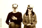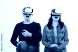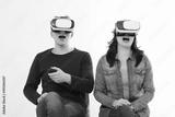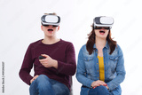 Young man and woman in casual clothes in virtual goggles, vr isolated on white background. Technology and innovation concept. Copy space and mock up. Template