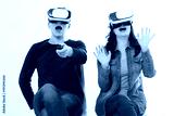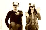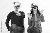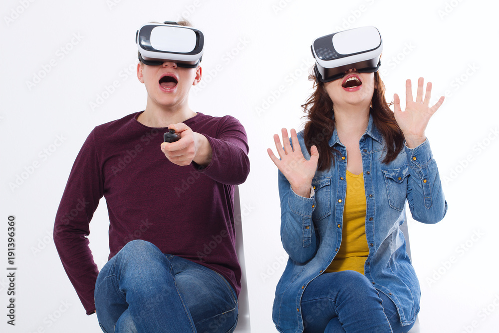 Young man and woman in casual clothes in virtual goggles, vr isolated on white background. Technology and innovation concept. Copy space and mock up. Template