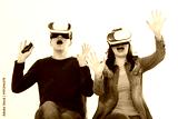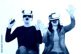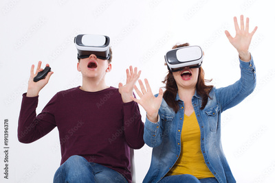 Young man and woman in casual clothes in virtual goggles, vr isolated on white background. Technology and innovation concept. Copy space and mock up. Template