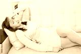 Tired middle age woman lying on sofa at home background with headache and depression. Menopause. Copy space and summer time