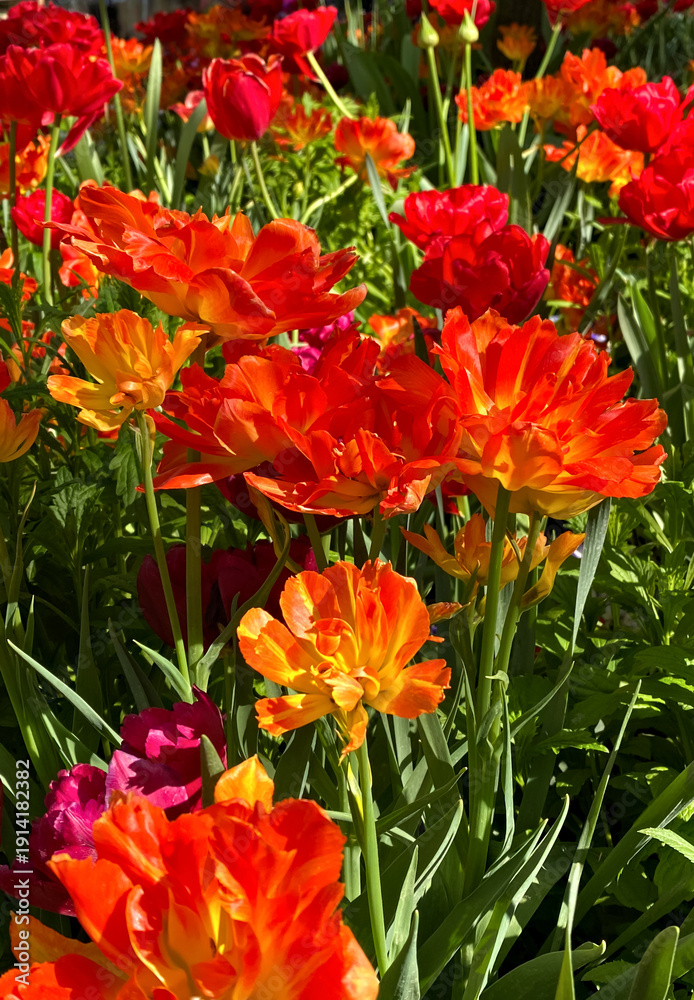 Bright orange and red spring flowers in full bloom create a lively natural garden scene, perfect for seasonal designs, nature backgrounds, and botanical concepts.