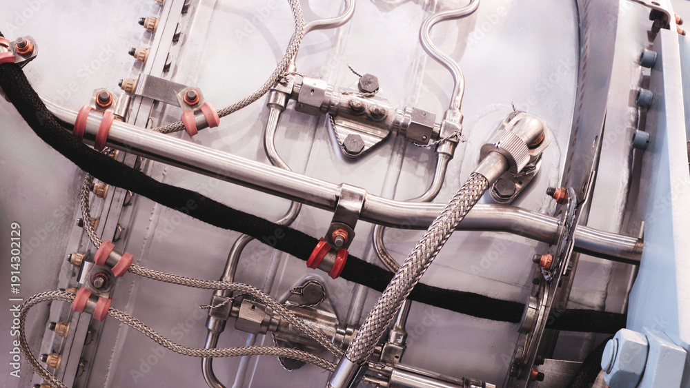 Close-up Open for service aircraft engine with many tubes of wires for valve switches and automation