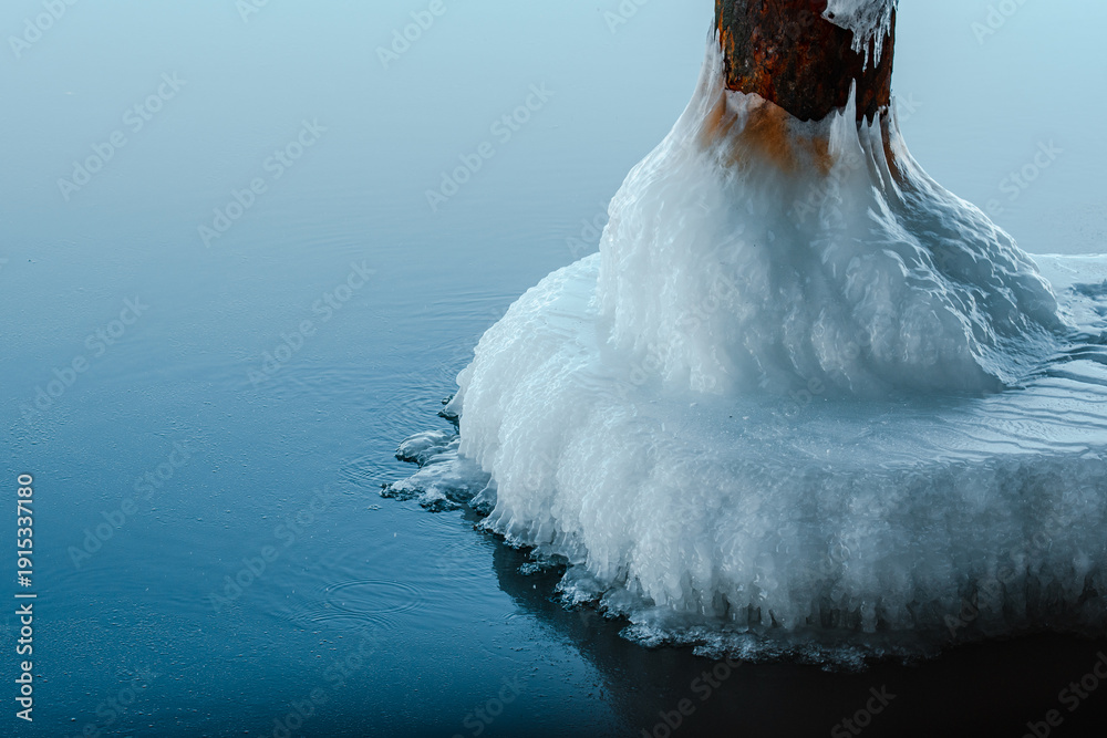 Frozen pier pillar encased in thick white ice, rising from calm blue winter sea under cold, tranquil conditions