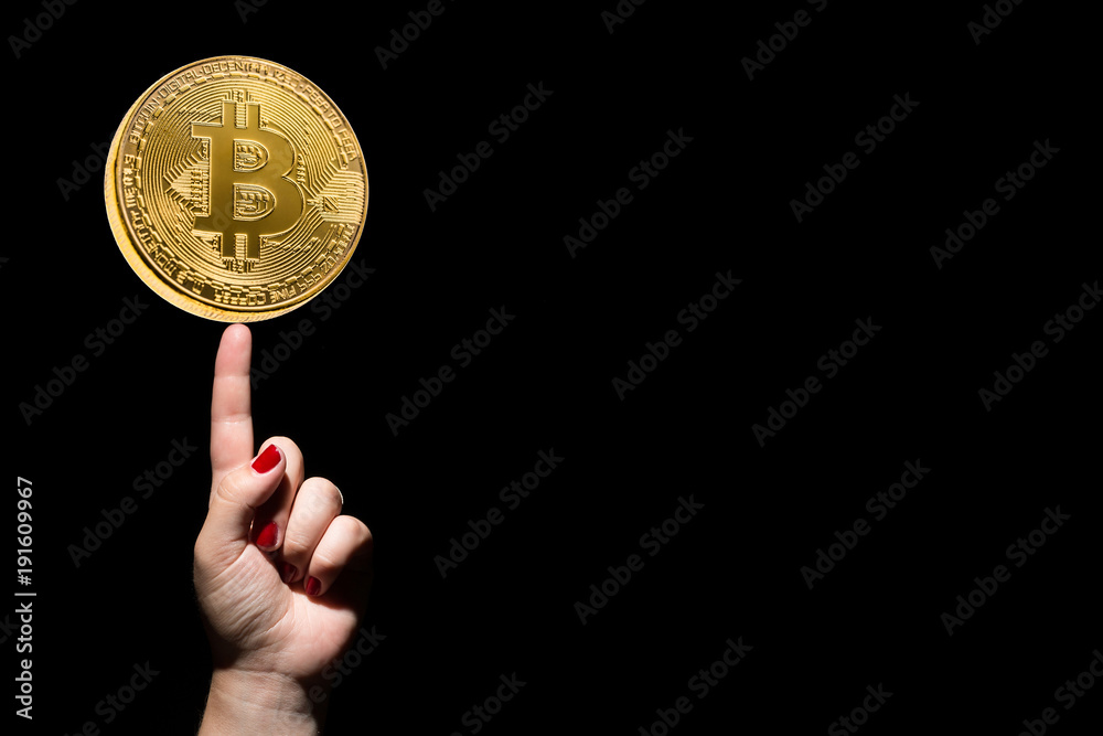 Idea and success concept. Golden bitcoin on female hand with trigger finger and red nails on black background. Copy space.