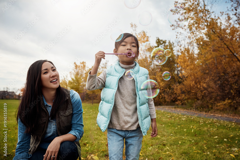 Happy, mom or daughter in park with bubbles, playful or bonding together in child growth. Fun, Asian woman or kid outdoor with blowing, healthy relationship or family connection in emotional security
