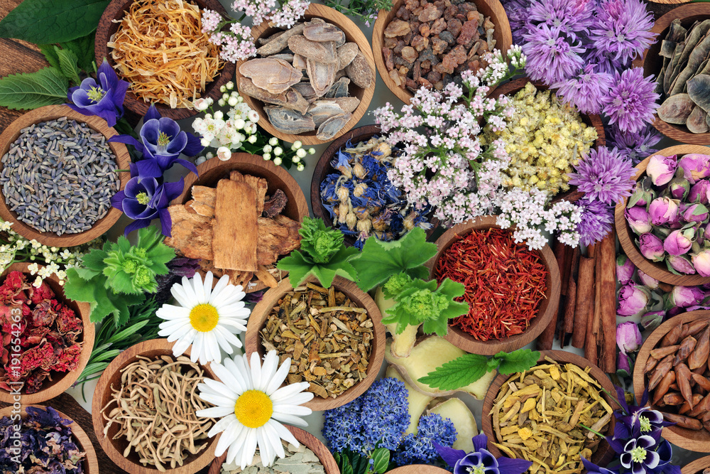 Herbal medicine with herbs and flowers used in chinese and natural alternative remedies with forming an abstract background. Top view.