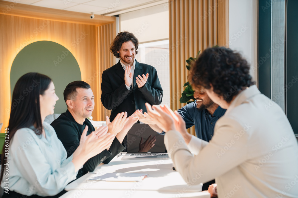 Professional business team having meeting discussing corporate strategy and project results using laptop in modern city environment showing teamwork leadership confident collaboration spirit