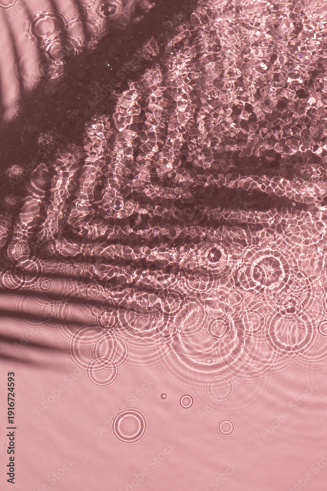 Pink water texture background on the noon sunlight with tropical leaves shadow.