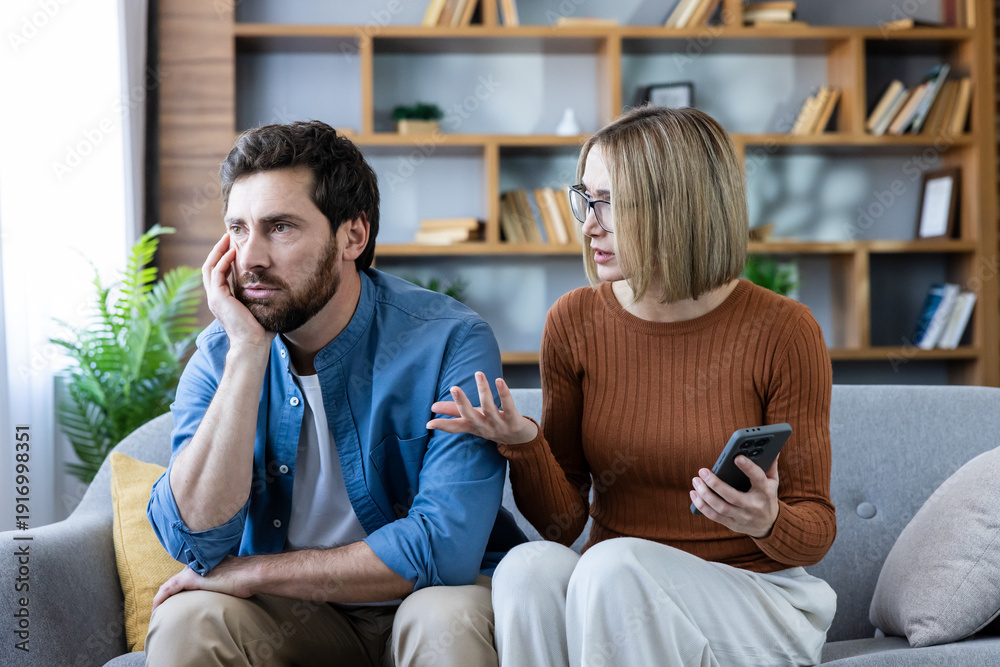 Upset man and an emotional woman are having a marital conflict at home, communicating about problems in their relationship while she holds a mobile phone