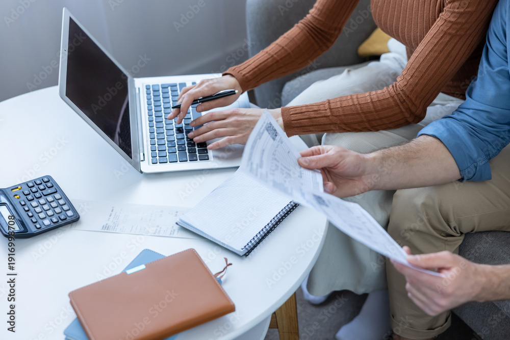 Couple sitting on a sofa, reviewing paper documents and bills while one person types on a laptop, actively managing household finances and planning their budget together