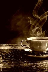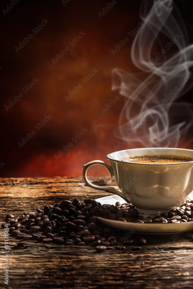 Coffee. Cup of coffee and coffee beans. Vintage cup and old oak table