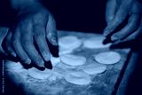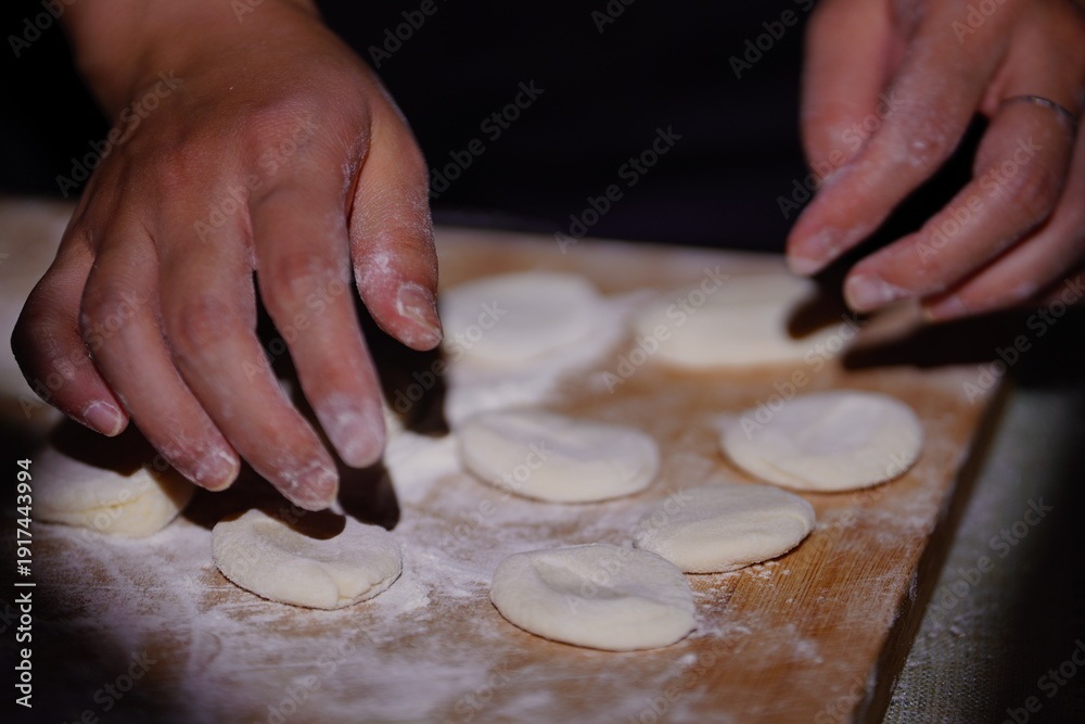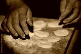 Dark-skinned hands meticulously shape rustic dumplings on a worn