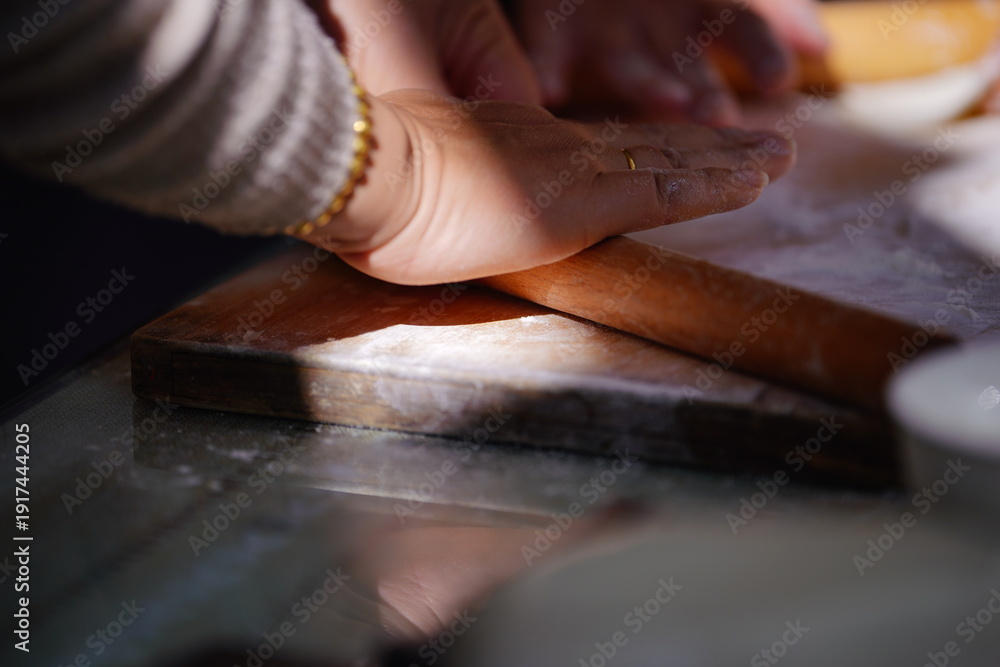 A focused intimate scene captures a hand shaping a dumpling wrapper