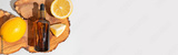Vitamin C cosmetics. Facial serum or essential oil in brown glass bottles with dropper dispenser, fresh lemons on wooden stand. Skincare concept, acid peels, spa treatments. Cosmetic packaging mockup