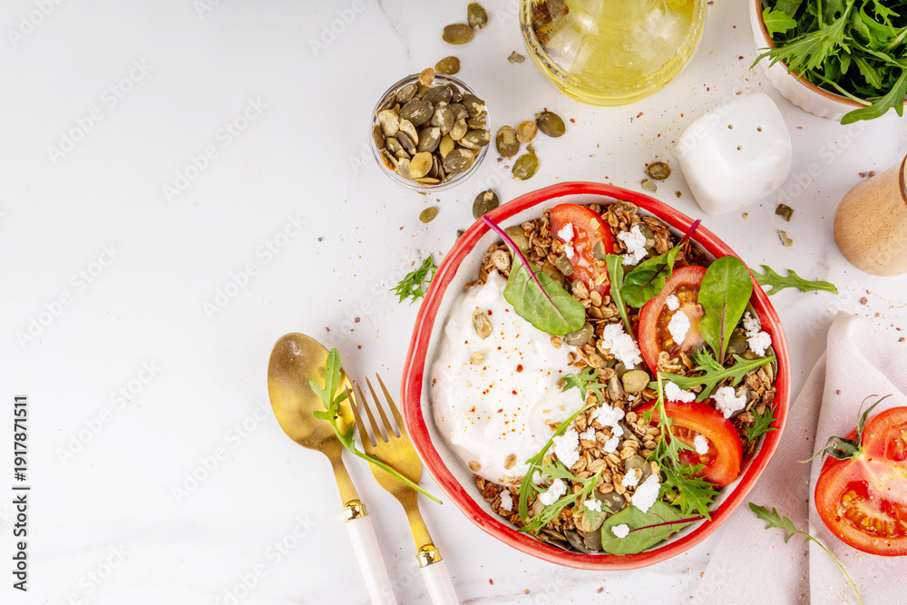 Savoury granola and yogurt breakfast bowl, balanced morning snack with greek yoghurt, tasty salted cheese granola, pumpkin seeds, nuts feta or tofu cheese, fresh vegetables and arugula