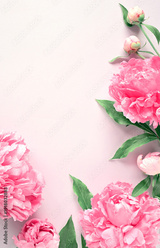 Summertime floral concept with bright purple peonies on pink background with copy space