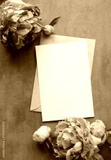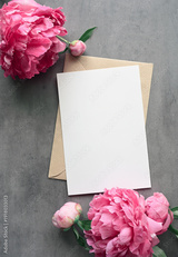Mock up card with peonies. Invitation card with envelope on grey background.
