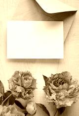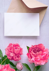 Mock up card with peonies. Invitation card with envelope on grey background.